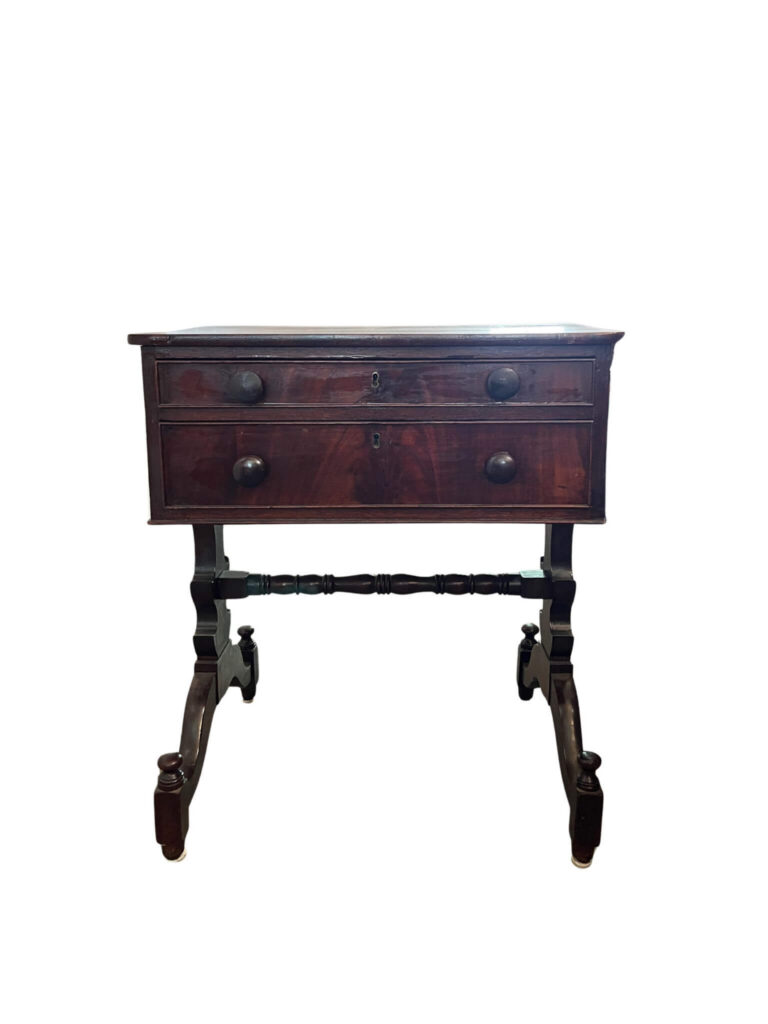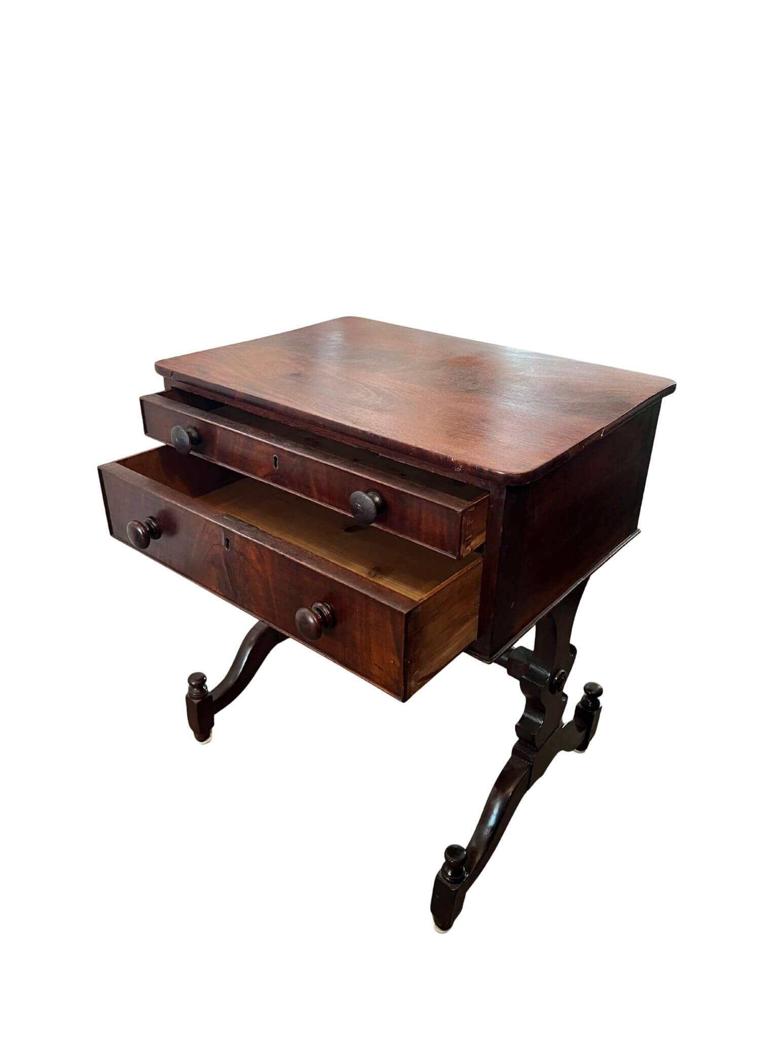 Antique mahogany side or work table featuring a rectangular top and two drawers with turned wooden knobs. The warm tone and fine grain of the mahogany highlight its elegant, traditional character.
