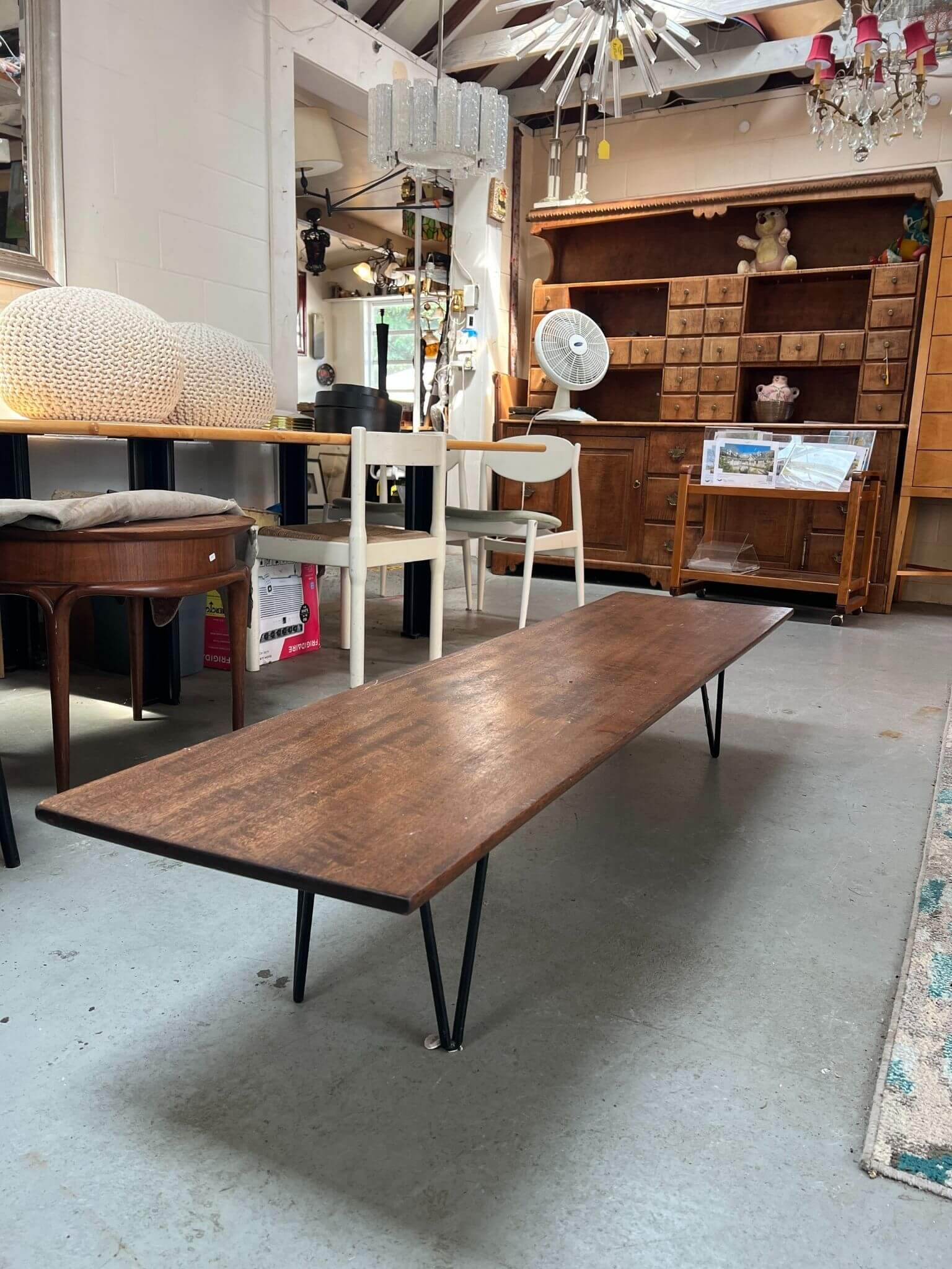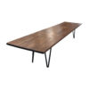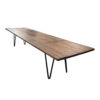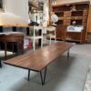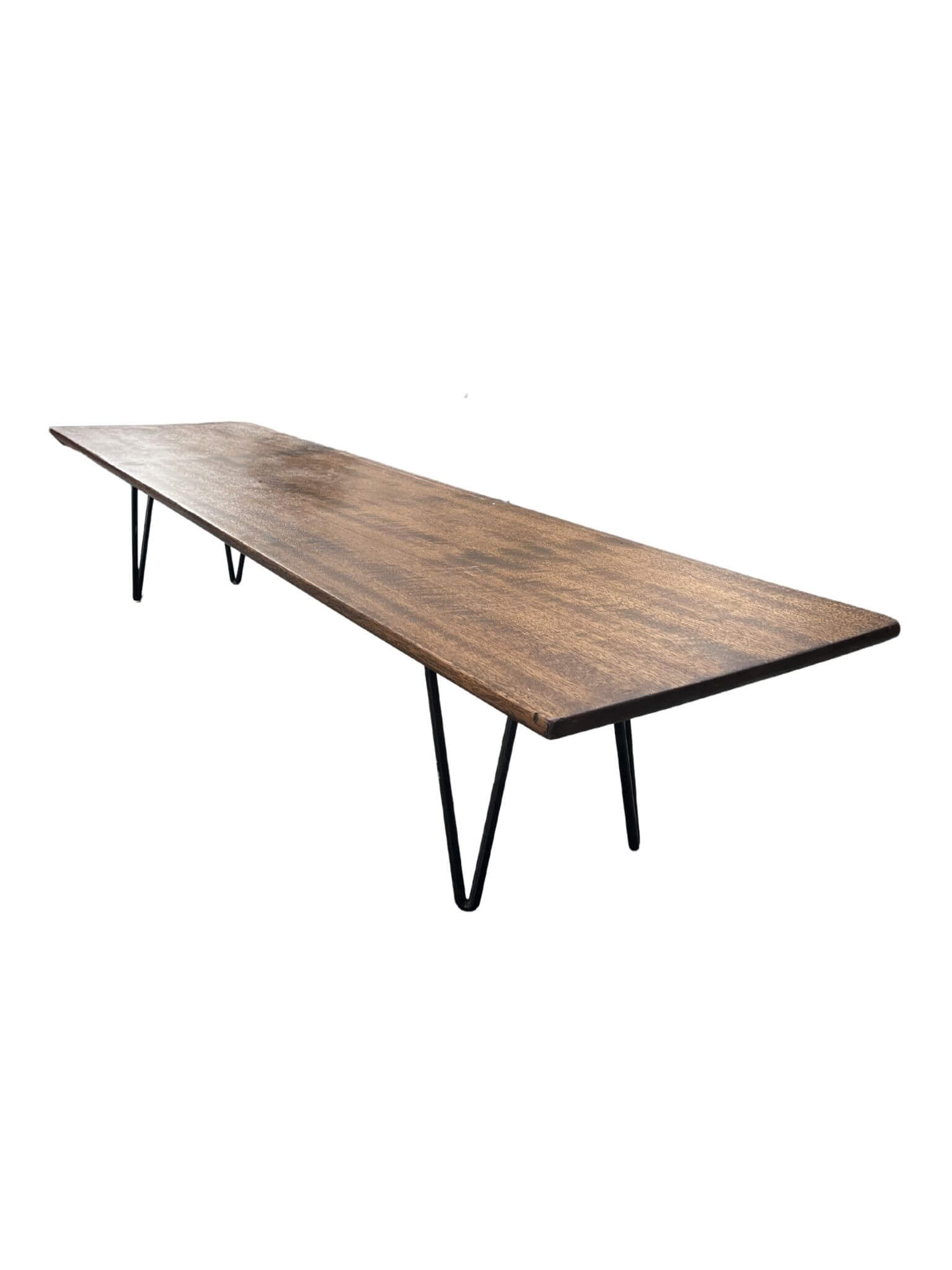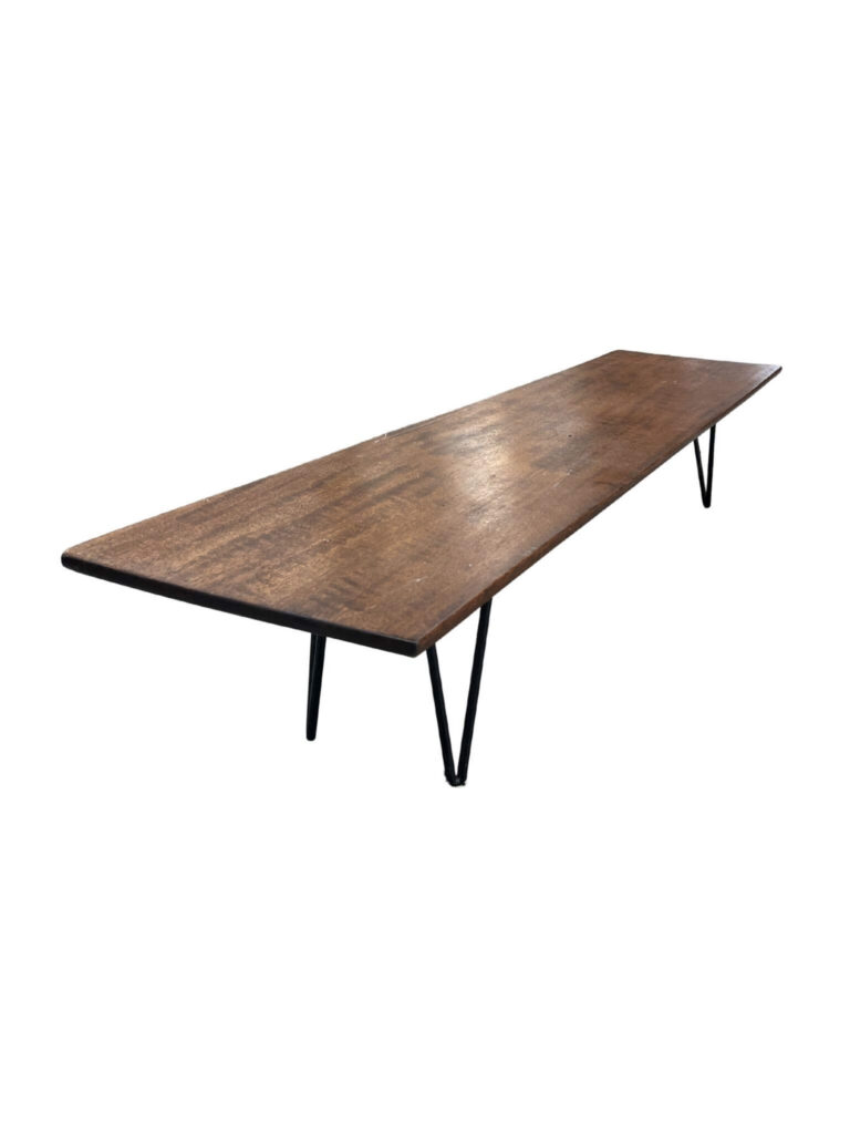 Minimalist mid-century coffee table featuring a long rectangular solid wood top and black metal hairpin legs. The design captures the Danish Modern aesthetic – simple, elegant, and functional. Ideal for a spacious living area or minimalist interior.