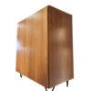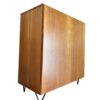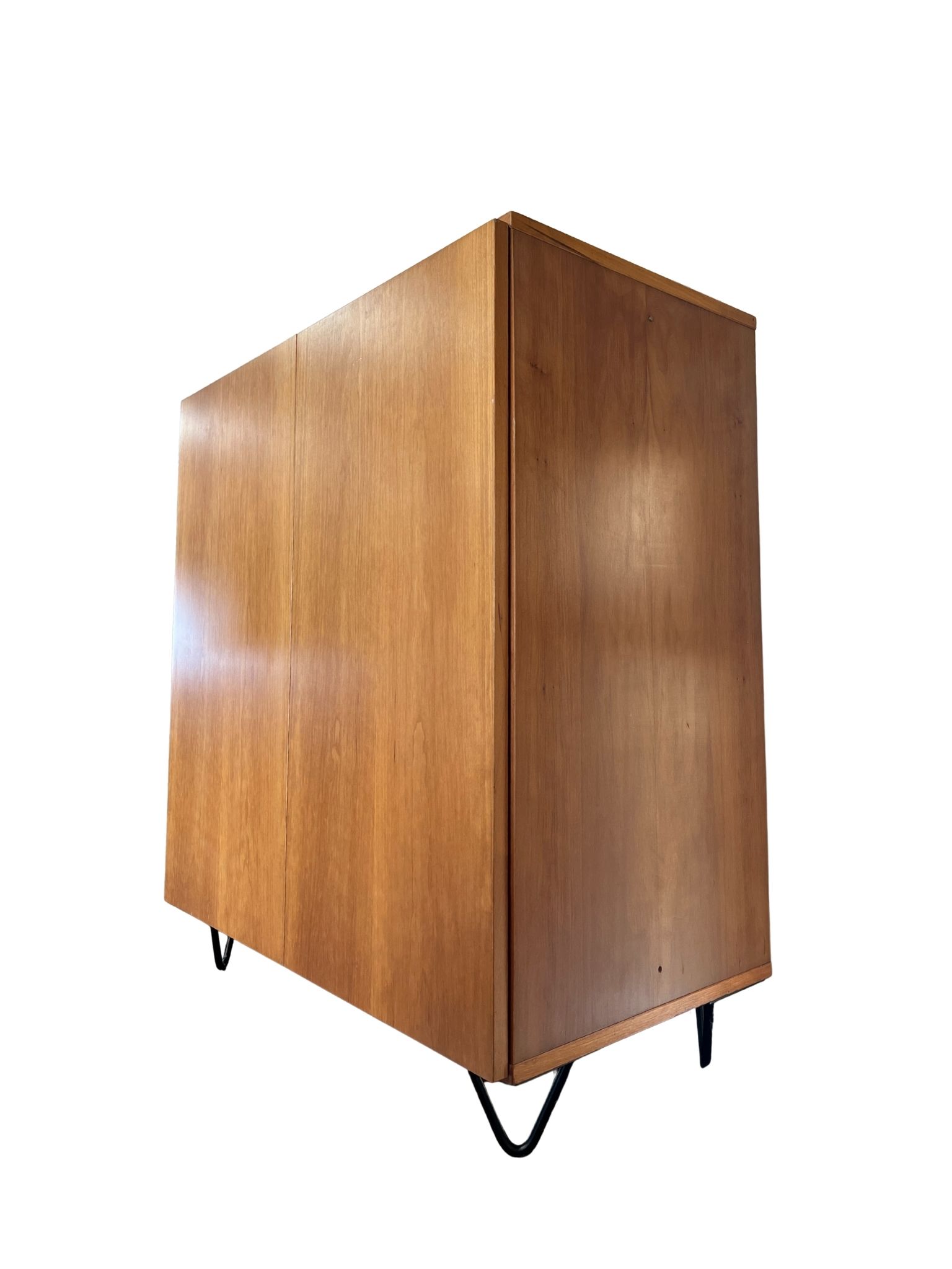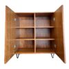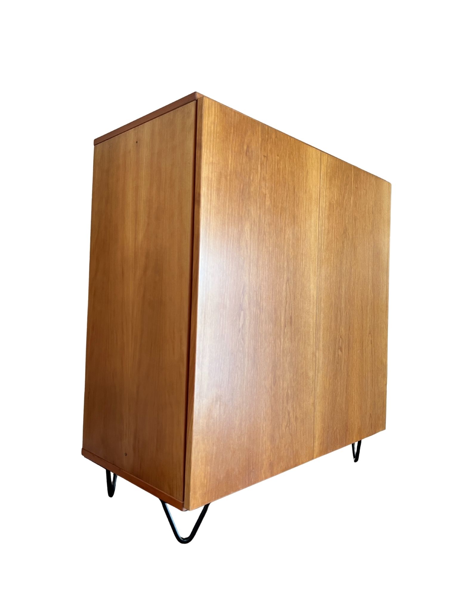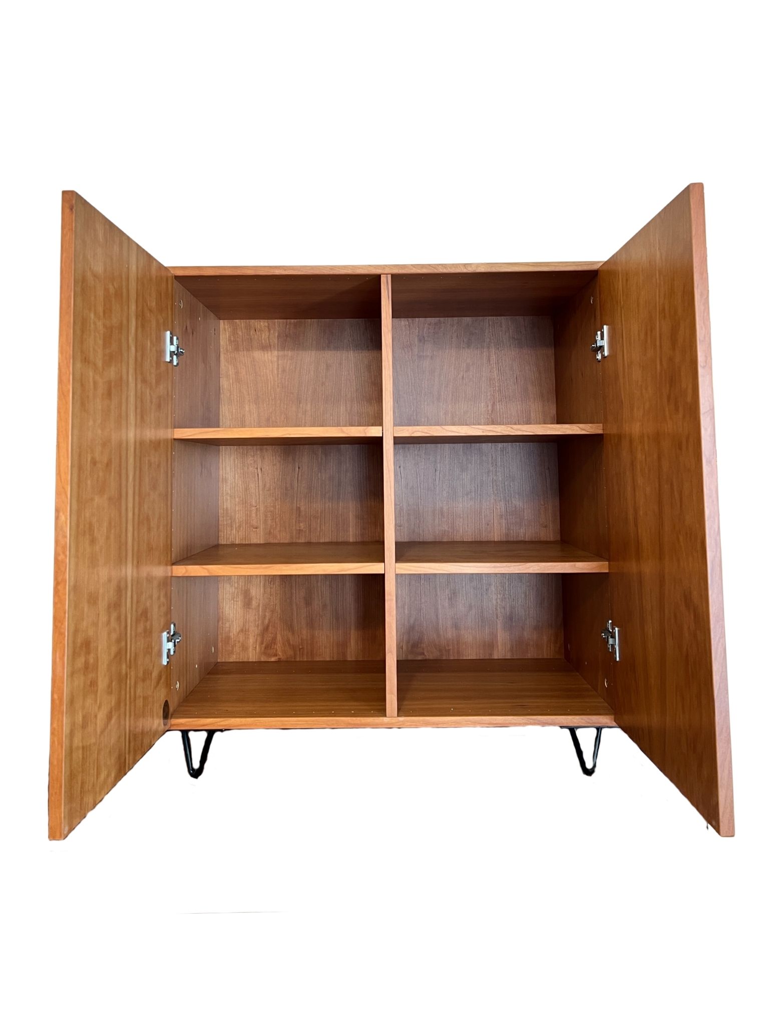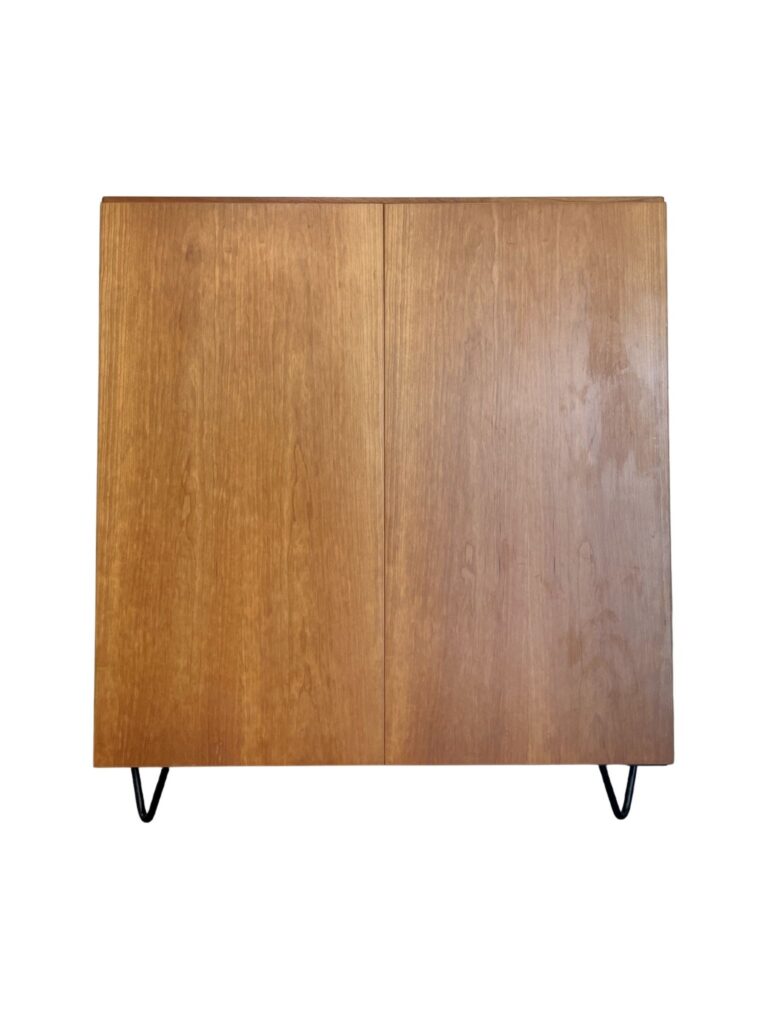 Mid-century Danish teak cabinet by Levenger Bookbox featuring clean modern lines and natural teak veneer. Designed with double front doors and black metal hairpin legs.