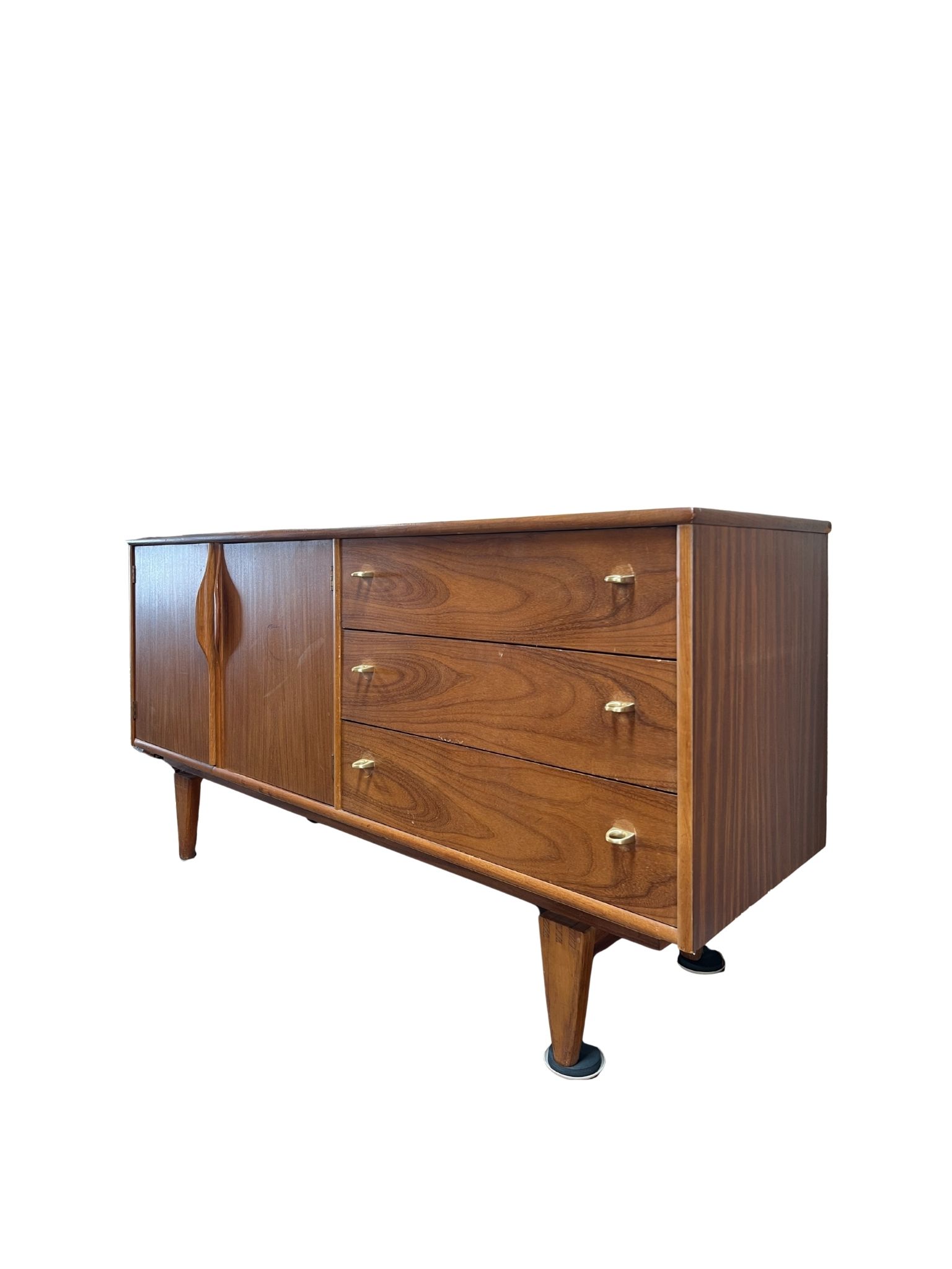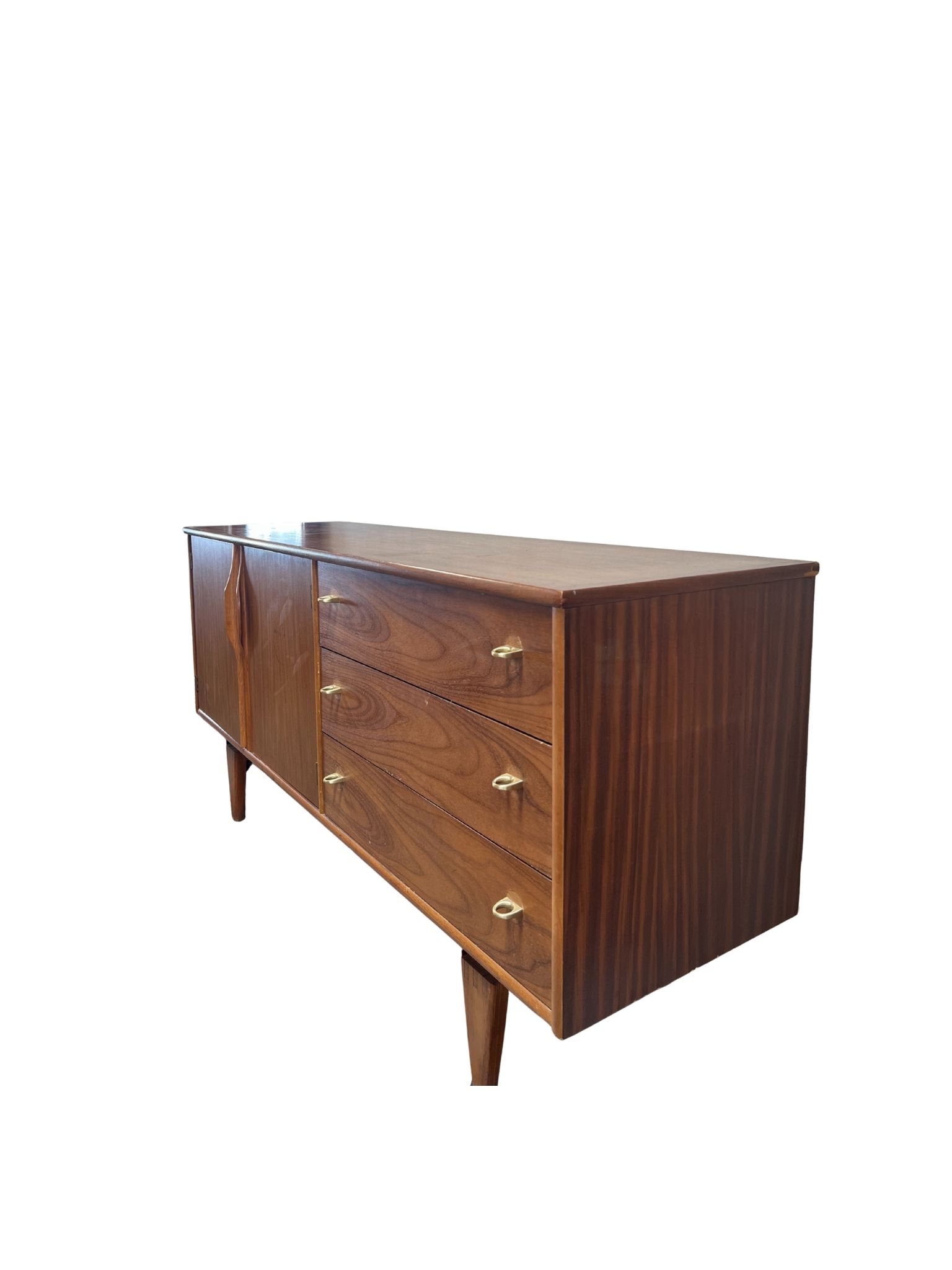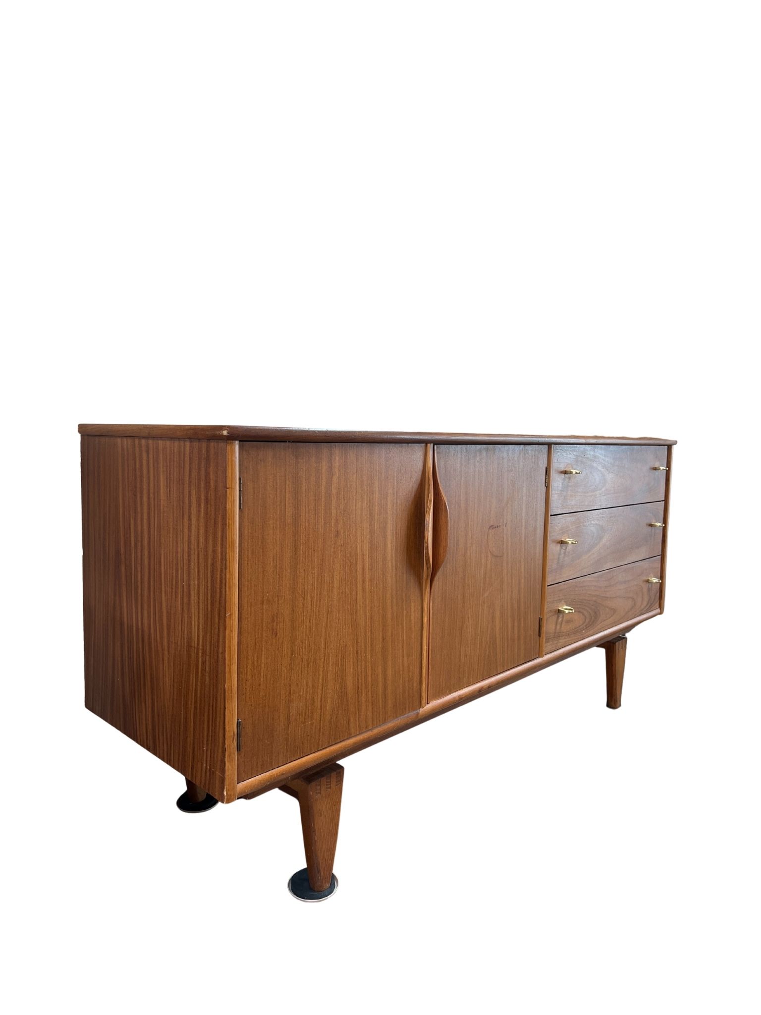 Mid-century modern walnut credenza by Stanley Furniture featuring tapered legs and a rich walnut finish. Includes a double-door cabinet and three drawers for versatile storage.
