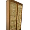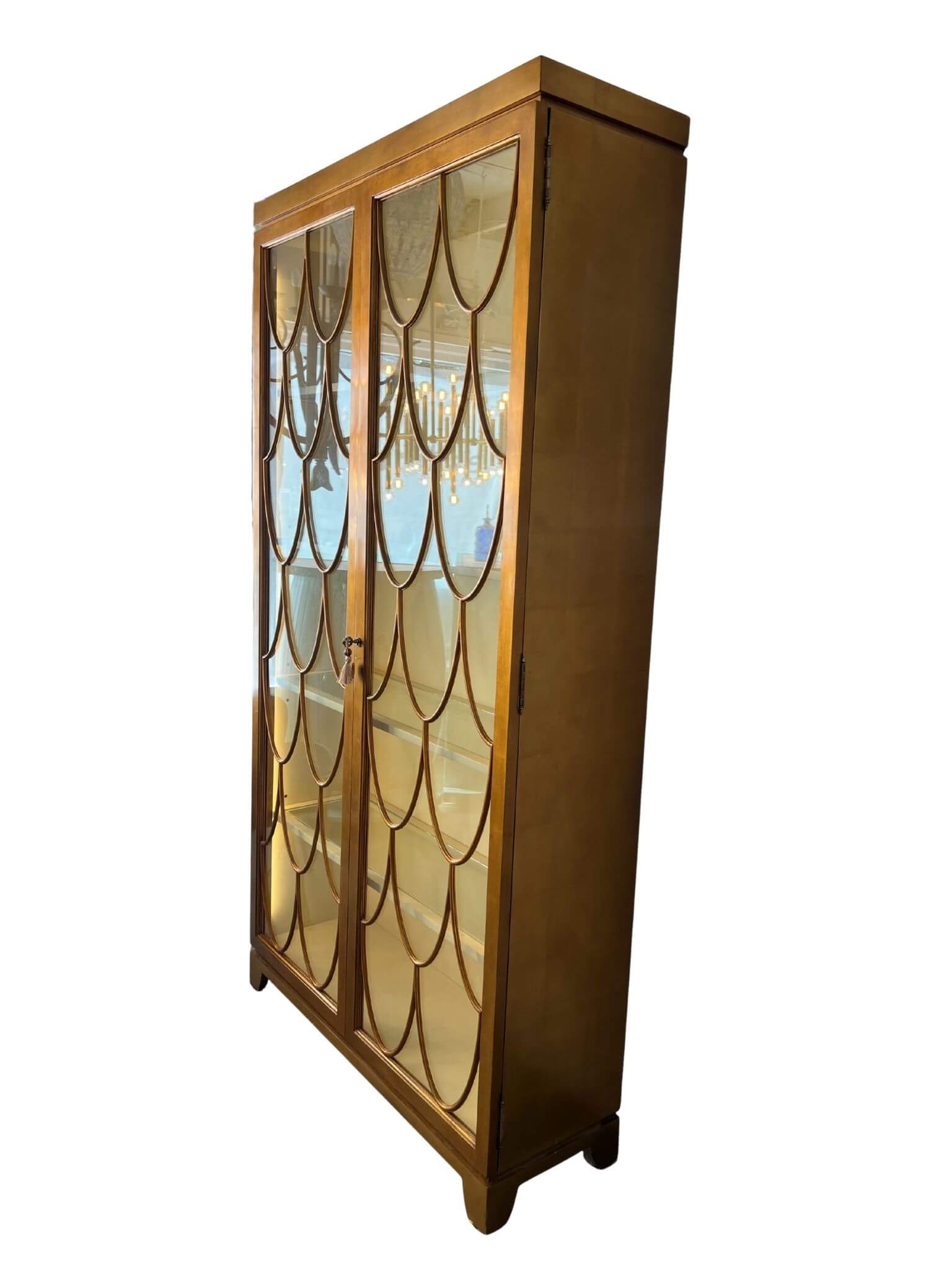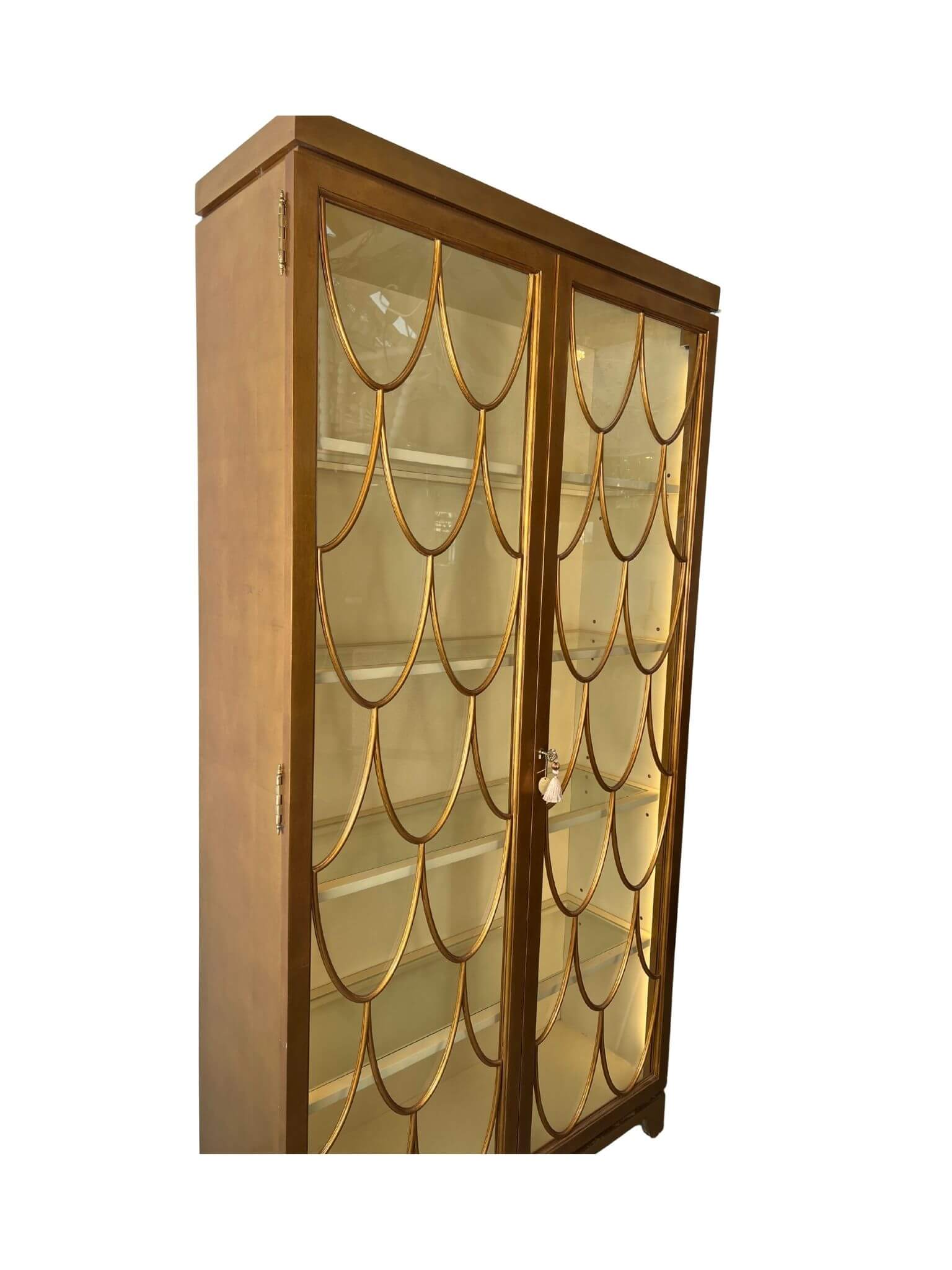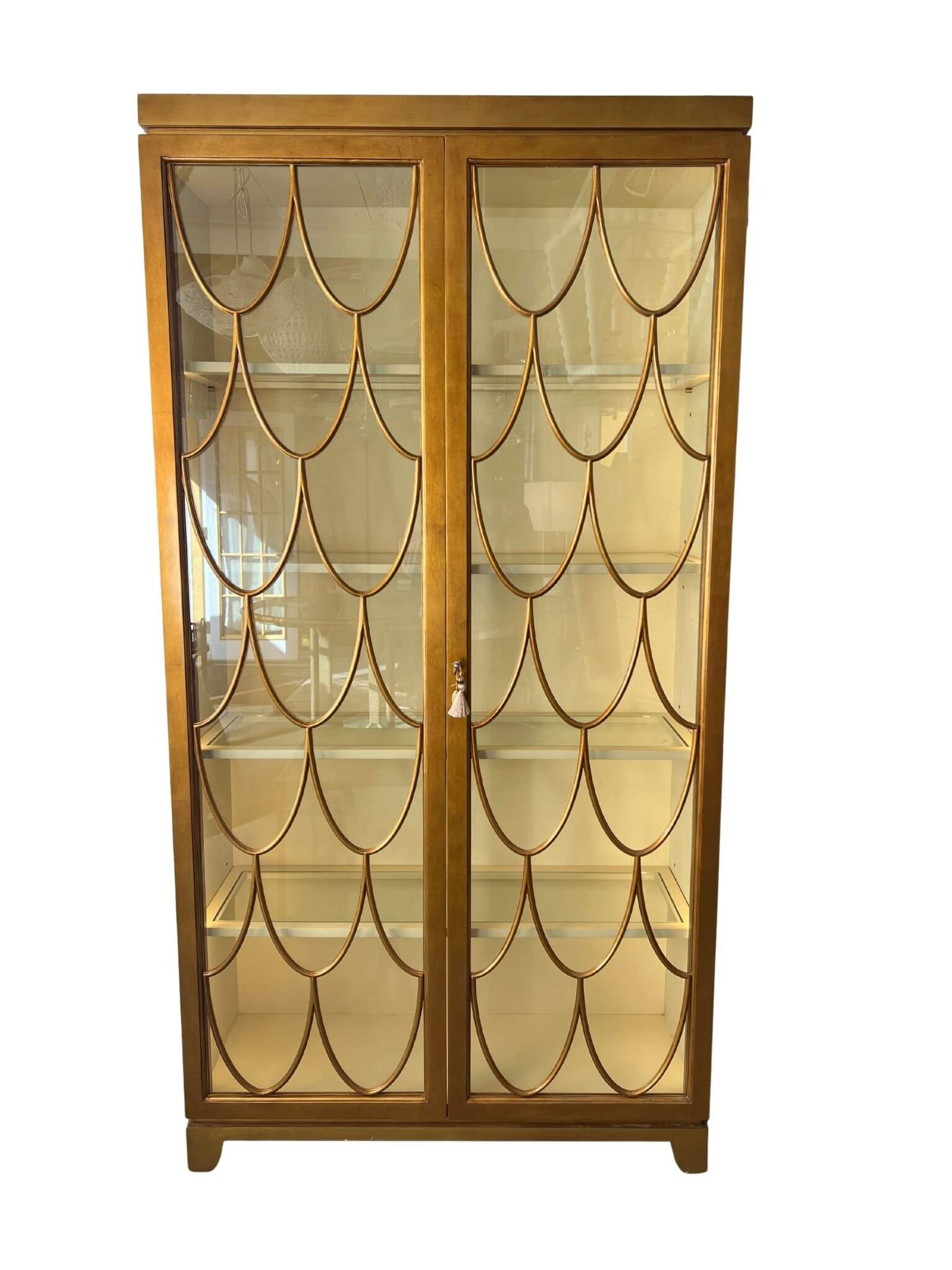 Theodore Alexander gilt display cabinet featuring glass doors with scalloped astragal detailing and an ivory-painted interior. The interior includes four adjustable glass shelves and built-in lighting, enhancing the display of decorative objects or fine tableware. The piece stands on short bracket feet and reflects the refined craftsmanship and quality design characteristic of Theodore Alexander furniture.