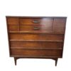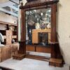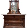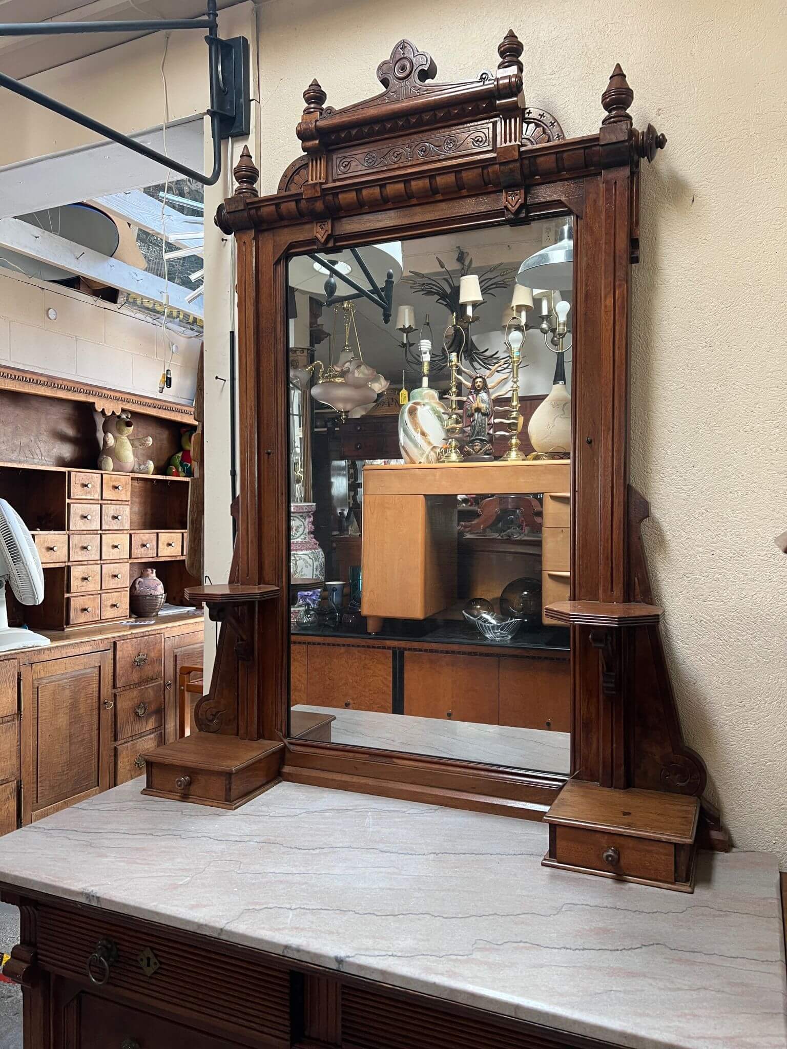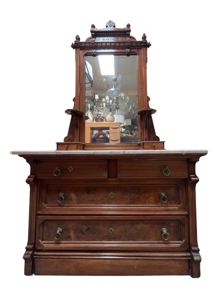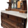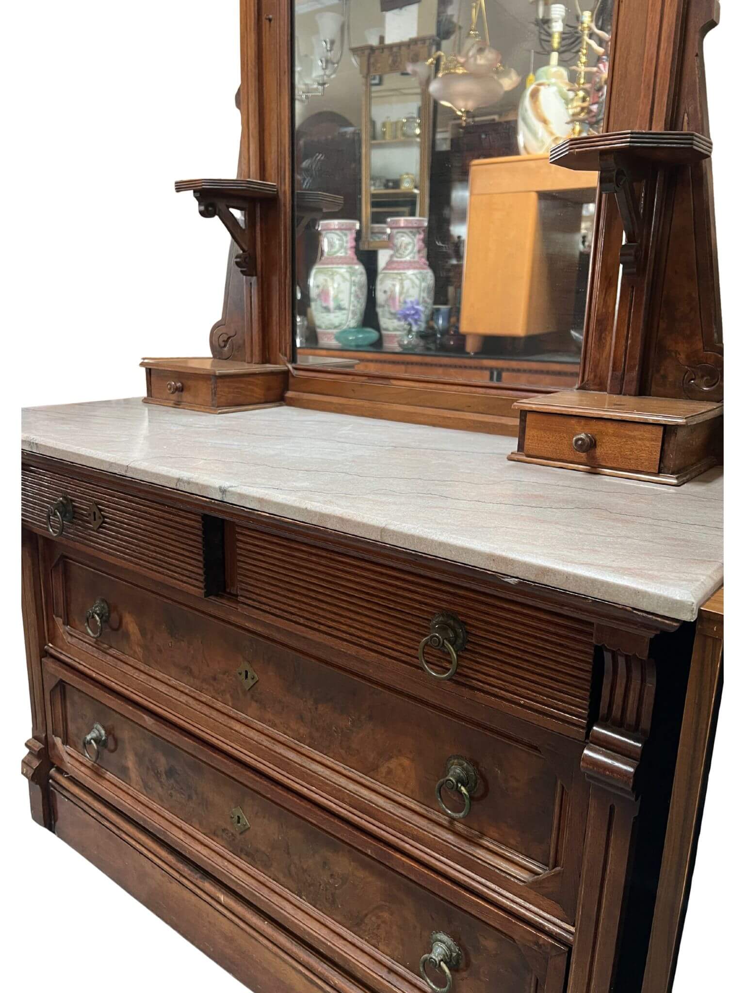 Late 19th-century Victorian dresser likely made of walnut with a warm brown finish. The piece includes three full-width dovetailed drawers with brass ring pulls and a white marble top. The upper section features a large mirror supported by carved uprights, small side shelves, and decorative finials.